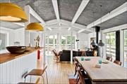 Dejligt nyere lyst og indbydende sommerhus i Bakkebølle med terrasse og vildmarksbad.