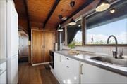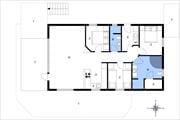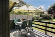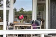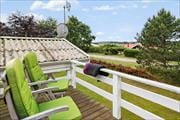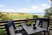Velholdt hus ved Samsøs vestkyst med træterrasse mod sydvest.