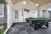 Når døren går op til dette rummelige sommerhus, mærker man straks, hvordan huset er skabt til samvær og afslapning. Det store opholdsrum med stue og køkken i åben forbindelse bliver hurtigt familiens naturlige mødested – her er der plads til lange måltider, hyggelige aftener og nærvær i hverdagsfri omgivelser. Lige ved siden af inviterer aktivitetsrummet til masser af timers ferieunderholdning. Her kan I udfordre hinanden i bordtennis og pool og skabe jeres egne ferieturneringer med grin og god stemning. De to hemse giver ekstra opholdsplads, og når kroppen trænger til ro, kan I sætte jer i saunaen og lade varmen omslutte jer – en dejlig afslutning på en aktiv feriedag.