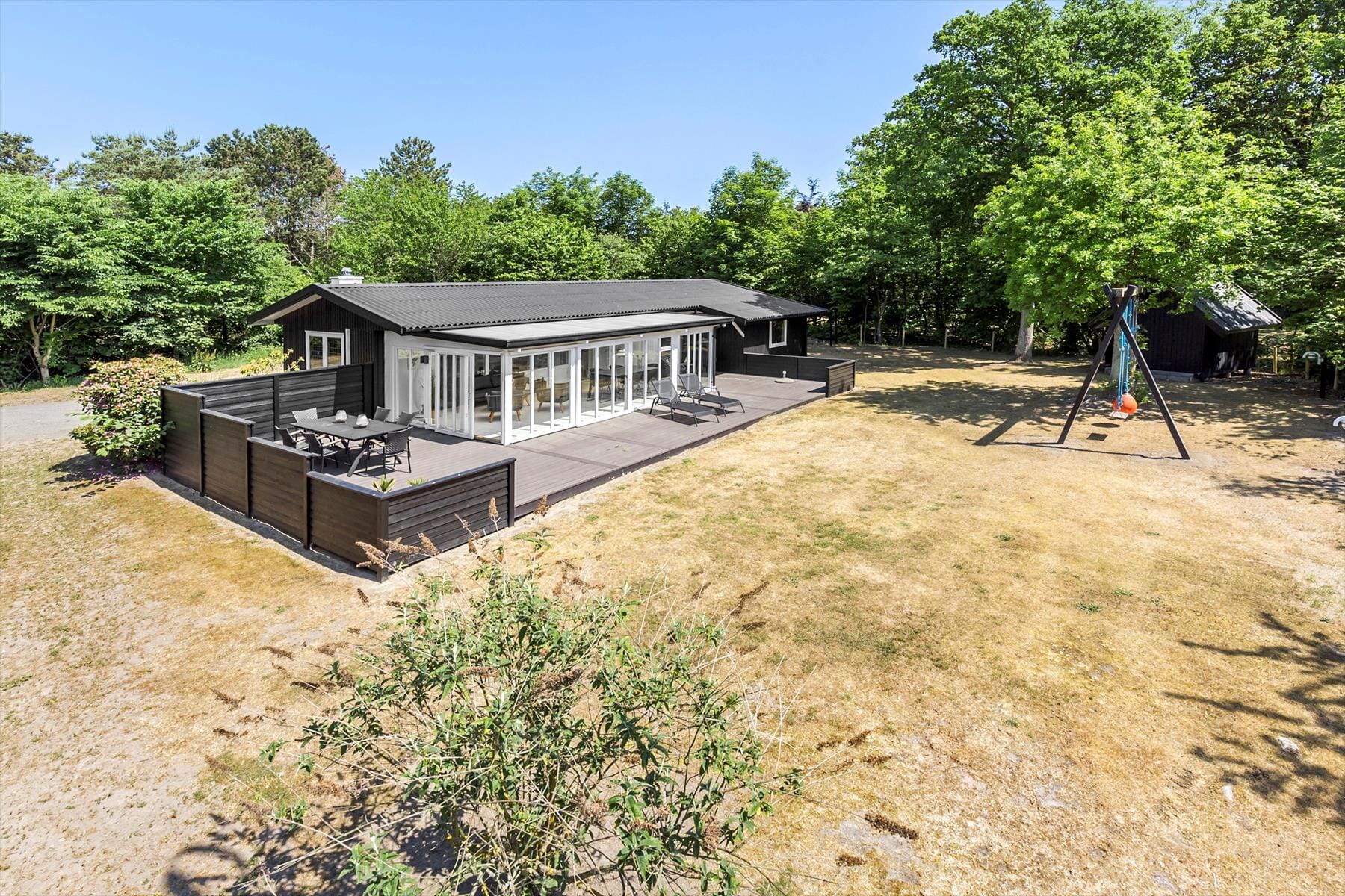 Her kommer du til et stilfuldt og harmonisk indrettet hus. Her er der masser af lys, de lyse farver giver huset en hyggelig atmosfære og lysindfaldet fuldender hyggen. Sofahjørnet i stuen vil helt sikkert blive her familien samles når dagens oplevelser skal deles. Spiseområdet finder du i udestuen, her har du en storslået udsigt over omgivelserne, fra spiseområdet har du udgang til terrassen. Køkkenet er rummeligt og praktisk indrettet og her er god plads når dagens måltider skal tilberedes. Huset har 3 soverum, 1 med dobbeltseng, 1 med 2 enkeltsenge og 1 med køjesenge. Badeværelset er enkelt og praktisk indrettet. Det ideelle hus til familieferien.