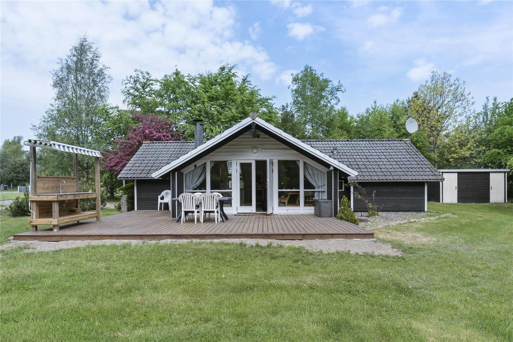 Den solrige og godt møblerede terrasse tilbyder dig et godt sted at slappe af. En del af terrassen er overdækket så du også, selv om duggen falder, kan nyde dagens sidste timer, måske endda til nattergalens smukke sang. Grunden er på 2.500 m2 og er meget velholdt. Her kan du godt invitere til en runde med fodbolden eller et kongespil.