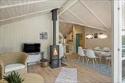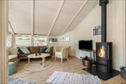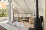Dette lyse sommerhus har en åben og god planløsning. Den store stue har sofaarrangement og spiseplads. Der er store vinduer og dør ud mod terrassen. Køkkenet er åbent og ligger i forlængelse af stuen. Huset har et stort badeværelse med gulvvarme, sauna og spa. Ved siden af de to soveværelser er der et gæstetoilet. Der er to gode soveværelser med dobbeltsenge samt et værelse med køjesenge. Dette er et komfortabelt hus med høj boligstandard.