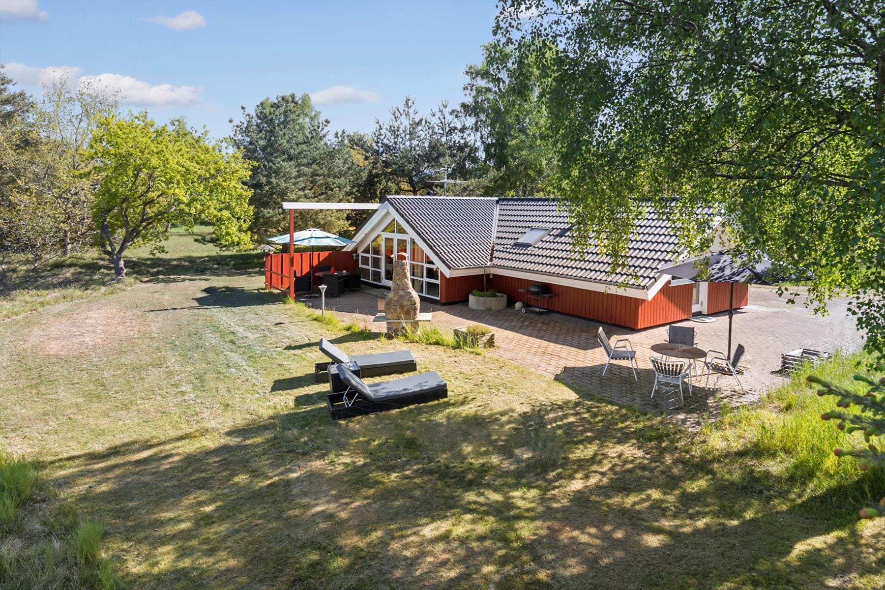 Fra stuen kommer man ud på den store fliseterrasse, som går rundt om huset. Det er havemøbler og mange gode steder at sidde og kigge ud over markerne. Der er en carport hvor man kan parkere bilen og et skur til cykler eller barnevognen. Den store grund ligger foran huset, og består af skov, og eng.