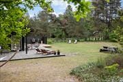 Terrassen vender mod vest, er møbleret og delvis overdækket. Her kan du tilbringe mange skønne timer. Tilbered middagen på grillen og nyd dagen gå på hæld i hyggeligt samvær og måske kommer nattergalen og synger sin smukke sang for jer. Her vil du og familien kunne nyde en rigtig god ferie. Naturgrunden er på 1.700 m2, så der er god plads til leg og spil. Du kan parkere ved huset.