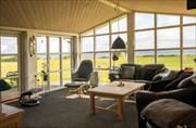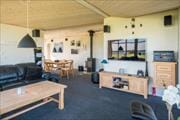 Huset er smagfuldt indrettet. Kombineret køkken-, spise- opholdsstue med brændeovn og den formidable udsigt over havet.