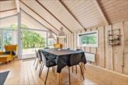 Her i huset har I masser af plads. Der er et velindrettet køkken i sammenhæng med spisestue og stue. I stueafdelingen er der brændeovn og en lille alkove, som bliver brugt som legerum til børnene. Overalt i huset er der indrettet med god smag. Sommerhuset har to dejlige badeværelser, det ene med spa og sauna. Alle fire værelser er lyse og har indbyggede skabe. Her bliver I mødt af en rigtig god stemning lige fra I træder ind af døren.