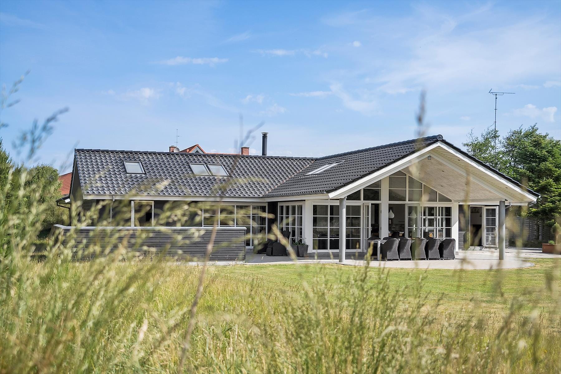 Den tjekkede stil fortsætter ude i det fri på den 2000 m2 store grund. Her er der masser af plads til at nyde livet på den delvist overdækkede terrasse, som ikke bare er udstyret med komfortable havemøbler og liggestole.