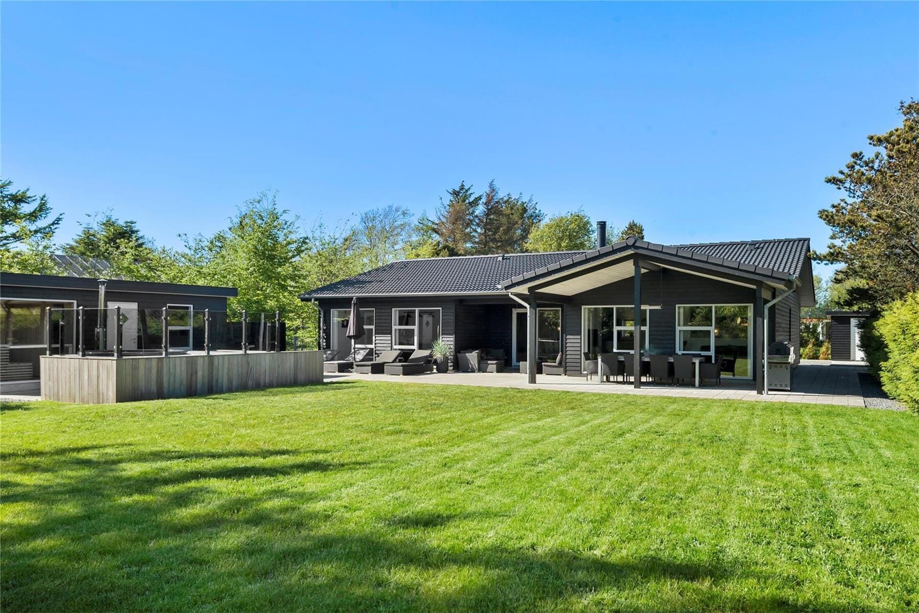 Fra annekset er der adgang til et fantastisk udendørs wellnessområde med panoramasauna og vildmarksbad. Her kan familien hoppe i det dejlige vildmarksbad, som opvarmes af den indbyggede brændeovnen. For de gæster, som er vilde med at gå i sauna, tilbyder sommerhuset en stor rummelig sauna. Fra saunaens kæmpe panoramavindue kan udsigten til brændeovnen i vildmarksbadet og de omkringliggende nåletræer nydes.