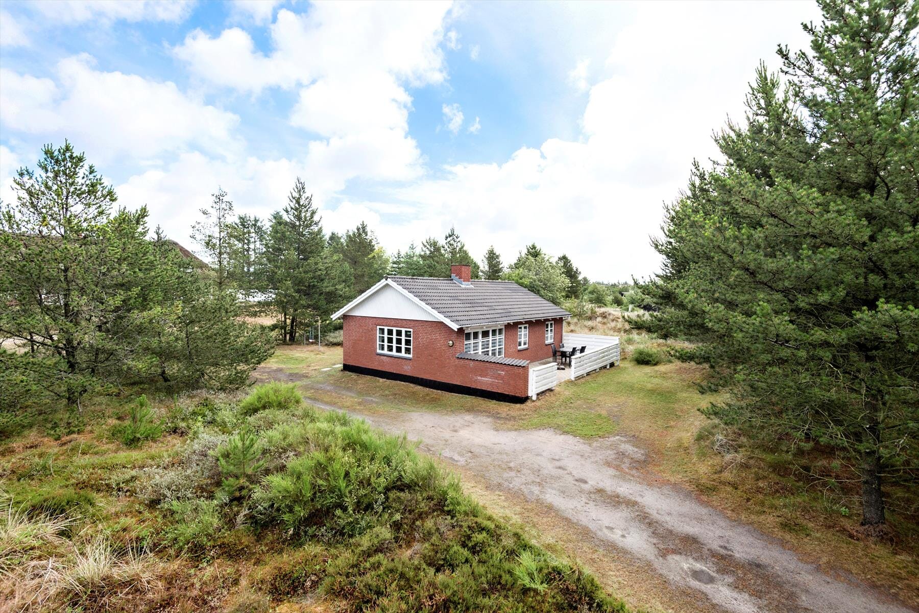 Udestuen er en fin siddeplads, hvis det er køligt eller blæsende udenfor, men når solen står højt på den blå himmel, vil I sikkert hellere slå jer ned på den sydvendte terrasse. Den har I direkte adgang til fra stuen, så det er nemt at tage frokosten med udenfor eller hente en ekstra iskaffe i køkkenet, og om aftenen er der mulighed for at grille. En god græsplæne ligger tæt på huset, mens resten af den store grund er holdt på mere naturlig vis.
