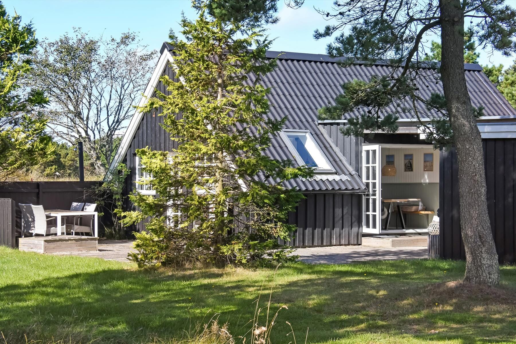 Udenfor venter en stor og dejlig naturgrund, der giver følelsen af at have sit eget lille fristed midt i Blåvands smukke natur. Børnene vil elske at lege på græsset, svinge sig i legetårnet eller udforske området omkring shelteret, hvor de kan lege små eventyr i timevis. For de voksne er der masser af gode opholdspladser at vælge imellem – ikke mindst den overdækkede terrasse med ovenlysvinduer. Her kan I åbne helt op til huset og lade ude og inde smelte sammen. Det gør det nemt at forlænge sommeraftenerne, selv når duggen falder, mens duften af grillmad og lyden af fuglesang fuldender stemningen.
