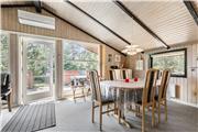 I huset er der et hyggeligt køkkenalrum og stue med god plads til seks personer. I stuen kan I nyde aftenerne med ild i brændeovnen eller kortspil ved spisebordet. Fra stuen er der direkte adgang til den sydvendte terrasse.