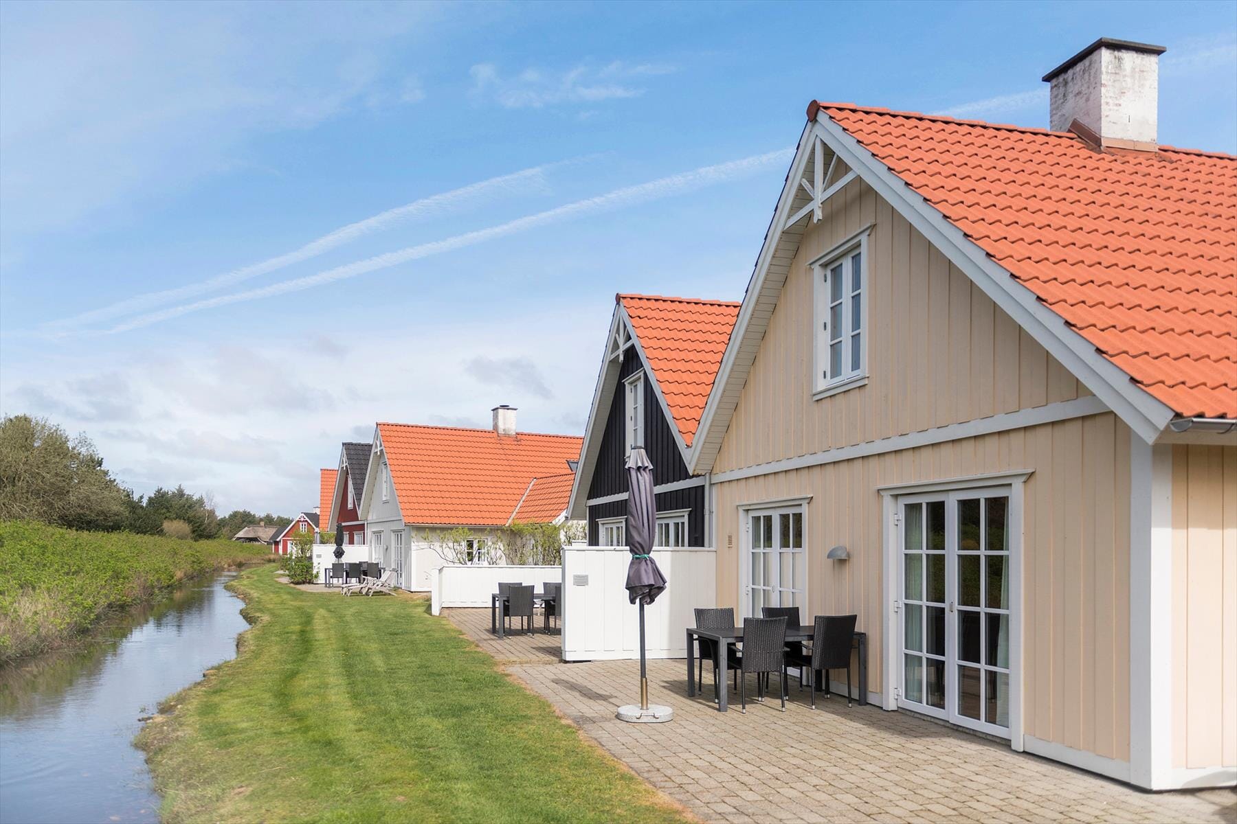 Der er noget svensk landidyl over de udendørs omgivelser, når man ser rækkehusenes charmerende træfacader og det lille vandløb, der risler i baghaven, men huset ligger altså midt i Blåvand. Vandet kan du nyde synet af, når du slapper af på terrassen – og udearealet er vestvendt, så du kan passende sidde her i solen om eftermiddagen og aftenen, når du er vendt hjem fra dagens små og store udflugter. Omgivelserne er rolige i det lukkede område, og derfor kan det af og til være helt svært at forstå, hvor centralt huset egentlig ligger.