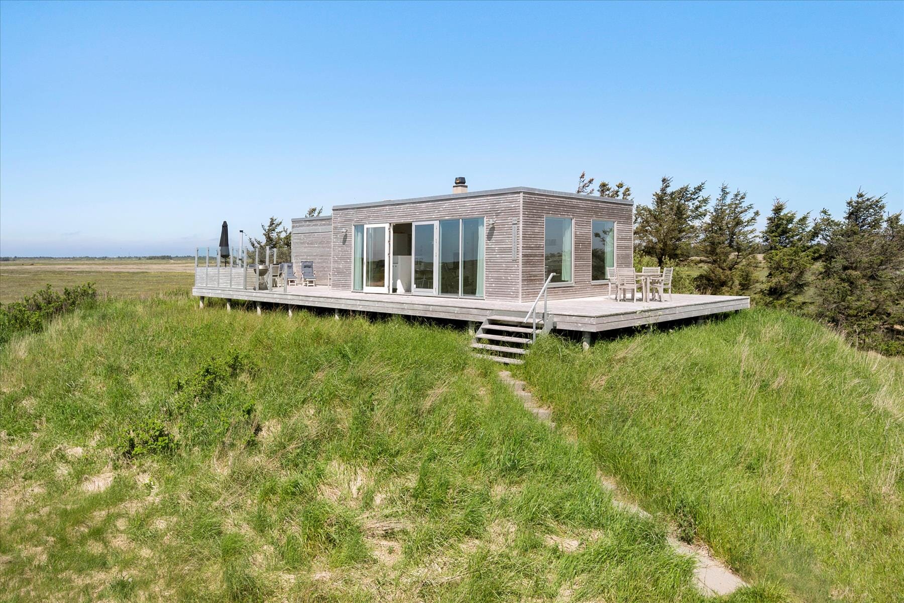 Ikke kun be­lig­gen­he­den er unik, men også ar­ki­tek­tu­ren får som­mer­hu­set til at gøre sig bemærket. Det moderne byggeri ligger hævet på en klit i det ellers flade og vidt­strak­te kyst­land­skab, og man kan tydeligt se på den flotte facade med træbeklædning og kæmpe vin­du­es­par­ti­er, at der er tænkt over både form og funk­tio­na­li­tet. Inden døre er interiøret primært holdt i sort-hvide nuancer, så rammen om hyg­ge­stun­der­ne er enkel og ind­by­den­de. Det betyder også, at om­gi­vel­ser­ne udenfor vinduerne får lov til at komme til deres ret: De åbne vidder og havet i ho­ri­son­ten er nemlig det flottest tænkelige bagtæppe, når I kok­ke­re­rer, sidder ved spi­se­bor­det og slapper af i sofaen nær ind­byg­nings­pej­sen. Foruden stuen med åbent køkken består planløsningen af et badeværelse og to soveværelser, og alle rum fremstår lyse og lækre. Kablet til El-lader bør være 7,5 meter.