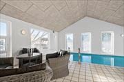 Som­mer­hu­sets po­o­laf­de­ling er virkelig med til at forsøde fe­ri­e­li­vet. Her kan I plaske i poolen og slappe af i saunaen, og I kan også læne jer tilbage i spabadet, der er placeret i en karnap med udsigt til haven. I husets store stue pynter også en karnap, som er med til at optimere ly­sind­fal­det. Der er desuden god loftshøjde og brændeovn, og det stilfulde møblement bidrager desuden til den skønne atmosfære. I den ene ende af rummet ligger et flot og funk­tio­nelt åbent køkken, og i den anden har I adgang til en hems. Planløsningen består for øvrigt af to badeværelser og fem lækre soveværelser med i alt 11 sove­plad­ser. Med så glimrende en rum­for­de­ling og hele 187 m2 at brede sig på er som­mer­hu­set et ideelt sted at samle familie og venner til en skøn wel­l­nes­sfe­rie.