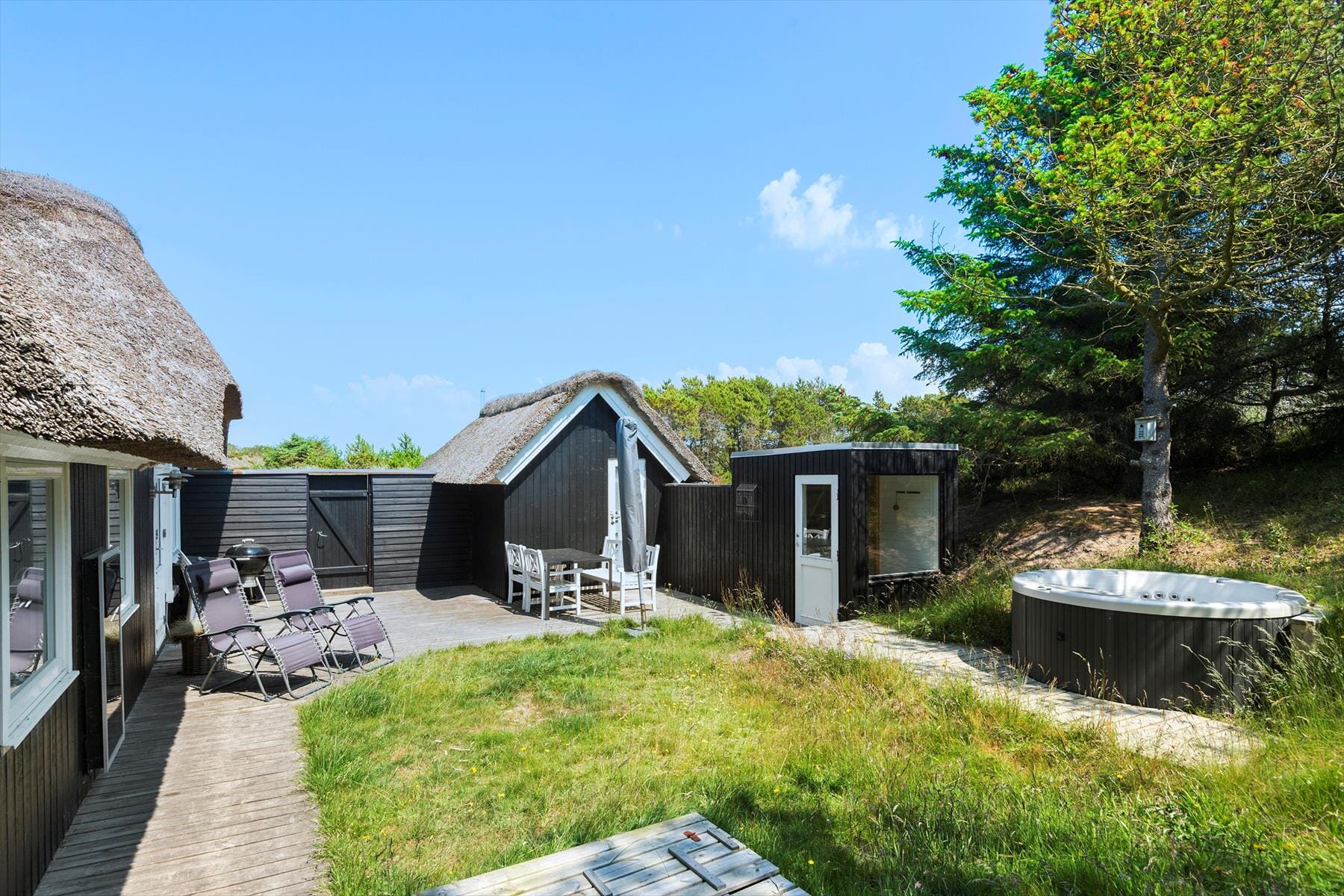 Hus-ID: BV214Dette stråtækte sommerhus har en særdeles attraktiv beliggenhed på en stor naturgrund midt i Blåvands smukke hedelandskab. Den naturskønne ferieadresse går godt i spænd med husets øvrige kvaliteter – der blandt andet tæller det lækre, udendørs wellnessmiljø med udespabad og sauna med panoramavindue.