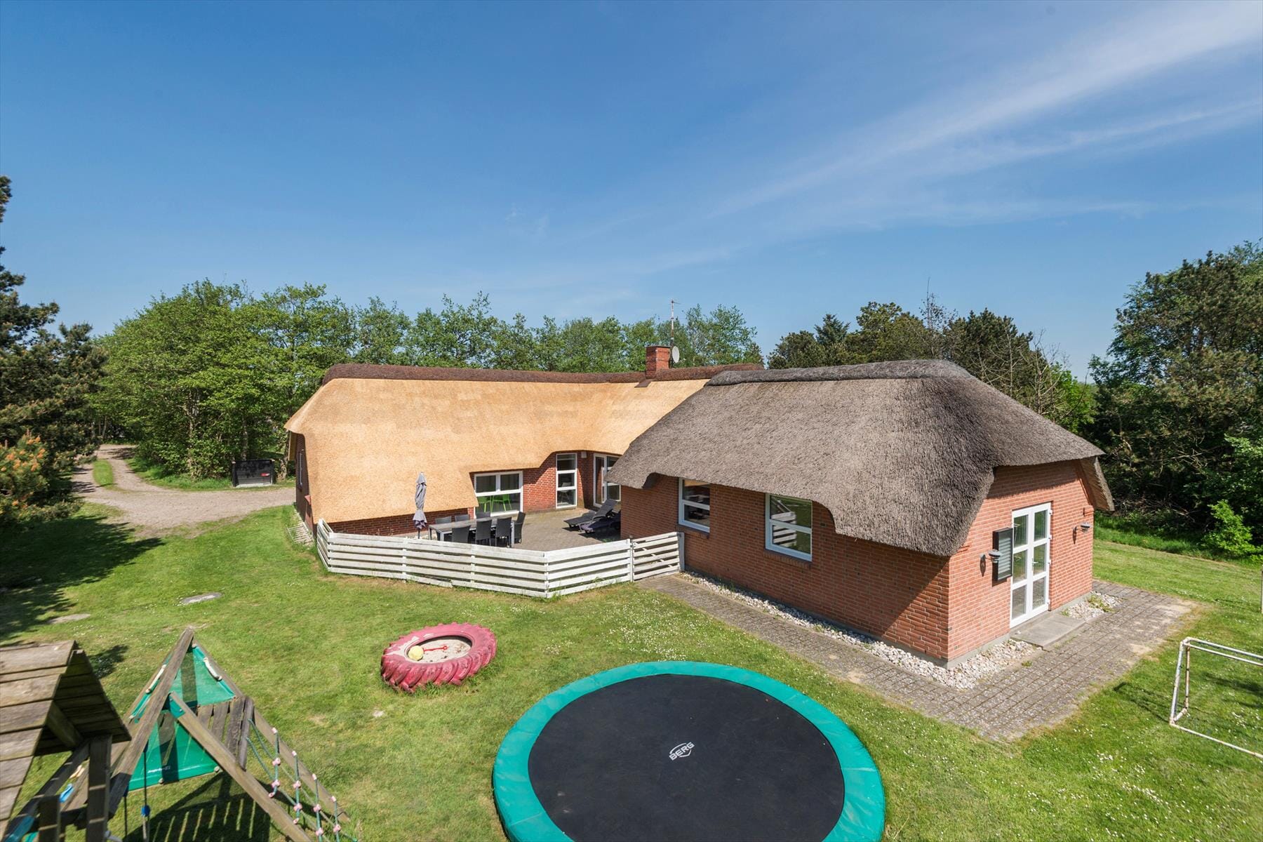 Den store naturgrund er godt omkranset af træer og anden randbeplantning, og derudover ligger den godt tilbagetrukket på den lukkede vej Savmøllen, så I kan nyde udelivet i fredelige og ugenerede rammer. Den sydvestvendte terrasse indbyder til solbadning og overdådige sommermåltider tilberedt på grillen – og hvis I har familiens hund med på ferie, vil du sikkert synes, at det er perfekt, at terrassen er helt lukket med hegn. De yngste feriegæster vil uden tvivl elske, at der er masser af legeredskaber til fri afbenyttelse, så de kan fylde ferien med trampolinhop, gyngeture og klatring i legetårnet.