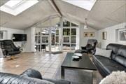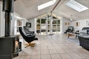 Som­mer­hu­sets hjerte og hyggelige sam­lings­punkt er stuen, der har loft til kip med oven­lysvin­du­er og aku­stik­pla­der – og det er bare lidt af de detaljer, der er med til at give det store rum en særligt skøn atmosfære. Sofaerne og det øvrige kom­fortab­le møblement sørger for, at du kan sidde rart, og selv når du står i det åbne køkken, har du en lys og ve­lud­sty­ret ramme om mad­lav­nin­gen. Det er muligt at være otte personer, ikke bare her i op­holds­af­de­lin­gen, men også på de fire soveværelser, når det er ved at være sengetid. Værelserne er for øvrigt smart fordelt i begge ender af huset, og begge afsnit er udstyret med et badeværelse, så huset passer ideelt til for eksempel to børne­fa­mi­li­er. På det største badeværelse er der skruet op for wel­l­nes­sfor­nem­mel­sen, for her finder du både et spabad og en sauna.