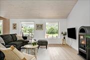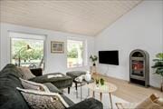 Med loft til kip og lys træbeklædning på væggene har rummene den helt rette sommerhusatmosfære, og møblementet er med til at gøre det til en komfortabelt oplevelse, når I slapper af og tager det med ro inden døre. Køkken og stue ligger i åben forbindelse, og centralt i rummet er en brændeovn placeret, så I kan skrue op for både varme og hyggestemning på årets kølige dage. De tre soveværelser er alle udstyret med komfortable senge, og et pænt badeværelse med bruser og gulvvarme hører også med til den gennemtænkte planløsning.