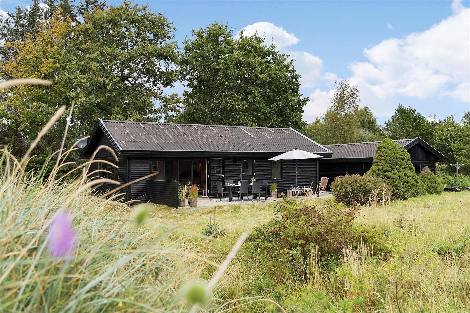 Udendørs er der rig mulighed for at nyde ferielivet. Sommerhuset ligger på en dejlig naturgrund, hvor træer og buske sørger for både fuglekvidder og privatliv. Rundt om huset finder du flere hyggelige terrasser – nogle åbne og solrige, andre overdækkede og med læ, så du altid kan finde en perfekt krog at slå dig ned i. Her kan du starte dagen med en kop kaffe i morgensolen, nyde frokosten under parasollen eller grille aftensmaden, mens du ser dagen gå på hæld. Naturgrunden indbyder til leg og udforskning for børnene, og de voksne kan slappe af med en forfriskning i hånden, mens feriestemningen langsomt falder på plads.