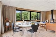 Indenfor mødes du af en rummelig og lys entré, der leder videre til husets hjerte, hvor sommerhushyggen straks indfinder sig. Stuen danner det naturlige samlingspunkt med komfortable møbler, brændeovn og store vinduer, der lader dagslyset strømme ind og giver udsigt til naturen udenfor. I køkkenet får du gode arbejdsforhold til feriekokkerier og samtidig mulighed at deltage i opholdsrummets øvrige selskab. Rummeligheden byder op til at tilberede lækre måltider sammen, spille brætspil ved spisebordet eller bare lade roen sænke sig med en god bog i sofaen, mens ilden knitrer i brændeovnen.