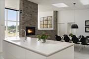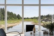 Det kubeformede byggeri består af et hovedhus på 100 m2 og et anneks på 50 m, som forbindes af en overdækning, så I kan tørskoede rundt. Planløsningen passer godt til otte personer og helt oplagt til to familier, for fire soveværelser og to badeværelser er ligeligt fordelt mellem de to bygninger. Det høje kvalitetsniveau og den stilsikre indretning kan ses og mærkes overalt – for eksempel på sommerhusets store badeværelse, der byder på et fritstående badekar og en dobbelthåndvask. I huset finder I desuden alt, lige fra et praktisk bryggers til en skøn hjemmebio med rigtige biografsæder, så I har rig mulighed for at hygge igennem med filmmaraton i løbet af ferien. I stuen står der også et fladskærms-tv, men det får dog skarp konkurrence fra den fantastiske udsigt over søens vandspejl og grundens grønne træer. Værd at bemærke er for øvrigt rummets flotte lysindfald, og takket være den gennemgående pejseindsats kan I også nyde skæret fra flammerne, når I laver mad i det åbne køkken eller nyder et lækkert måltid ved spisebordet.