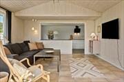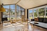 Indenfor mødes du af en rummelig stue med store vinduespartier, der lader lyset strømme ind og giver en smuk udsigt til naturen. Den åbne planløsning skaber en luftig og sammenhængende atmosfære, hvor det er nemt at samles til fælles aktiviteter eller finde ro i hinandens selskab. Det moderne køkken er veludstyret og indbyder til madlavning og samvær. Huset er indrettet med fokus på komfort og funktionalitet, hvilket gør det ideelt til afslappende feriedage.