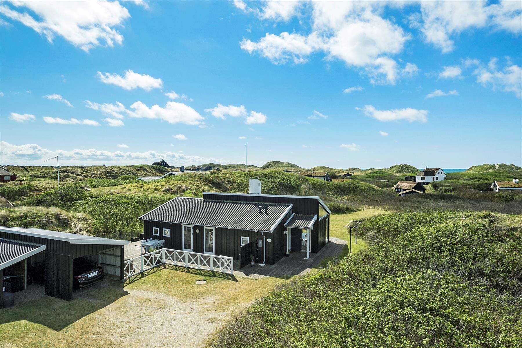 Rundt om hele huset breder sig et stort terrassemiljø med udebruser, dejlige solkroge og ugenerede opholdspladser. Et hegn skærmer terrassen af og giver privatliv, og vil I nyde udsigten, kan det anbefales at tage trappen op til plateauet, der fungerer som en fantastisk udsigtspost, hvorfra I kan se til havet. Bevæger I jer op ad bakken på grunden, kan I ligeledes skue ud over både hav, strand og klitter.