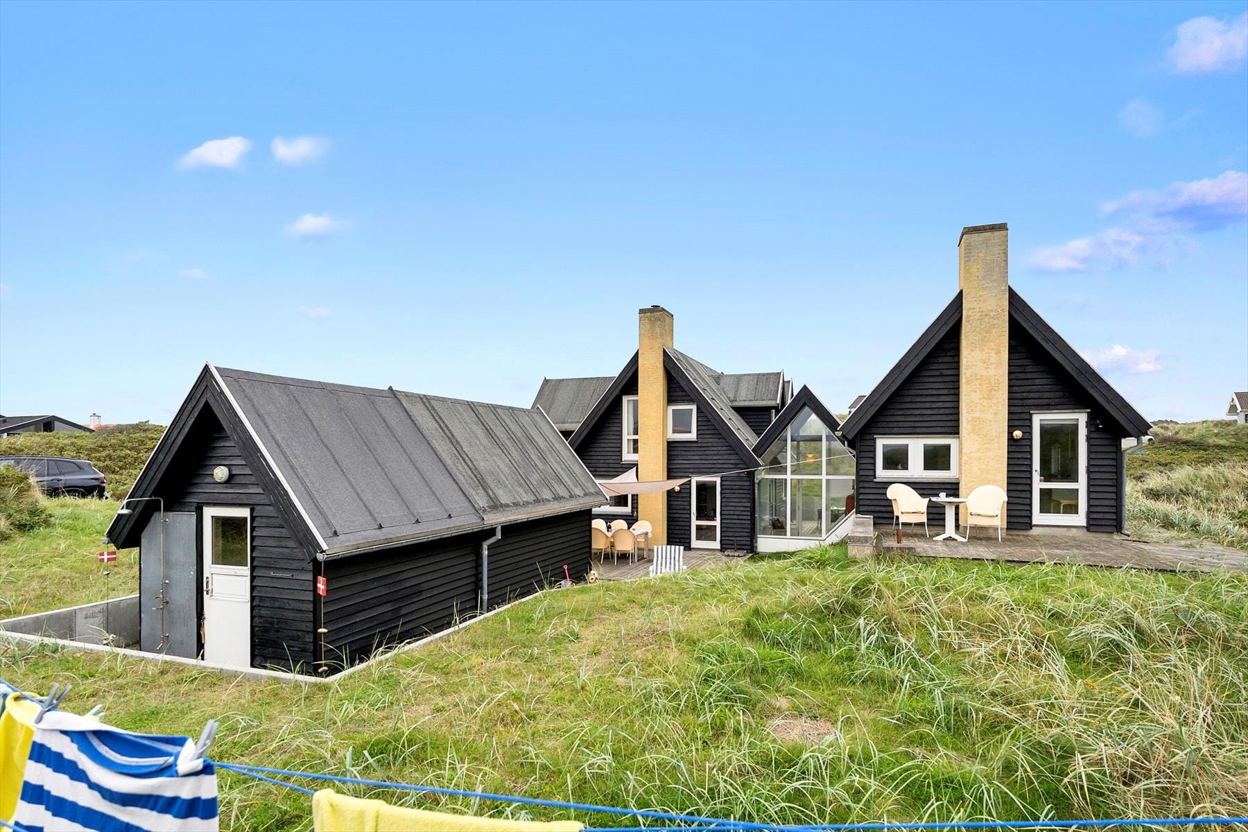 Sommerhuset har flere terrasser, som giver dig mulighed for at finde både sol og skygge i løbet af dagen. Måske starter du dagen på den østvendte terrasse med en dampende kop kaffe, mens solen langsomt stiger op over klitterne. Senere kan du søge mod den syd- eller vestvendte terrasse, hvor du kan nyde eftermiddagens sol, en kølig drink eller en hyggelig grillaften med familien. Haven er omkranset af træer og buske, som skaber en fredfyldt atmosfære – her kan børnene lege trygt, mens de voksne slapper af i havemøblerne og mærker roen sænke sig.