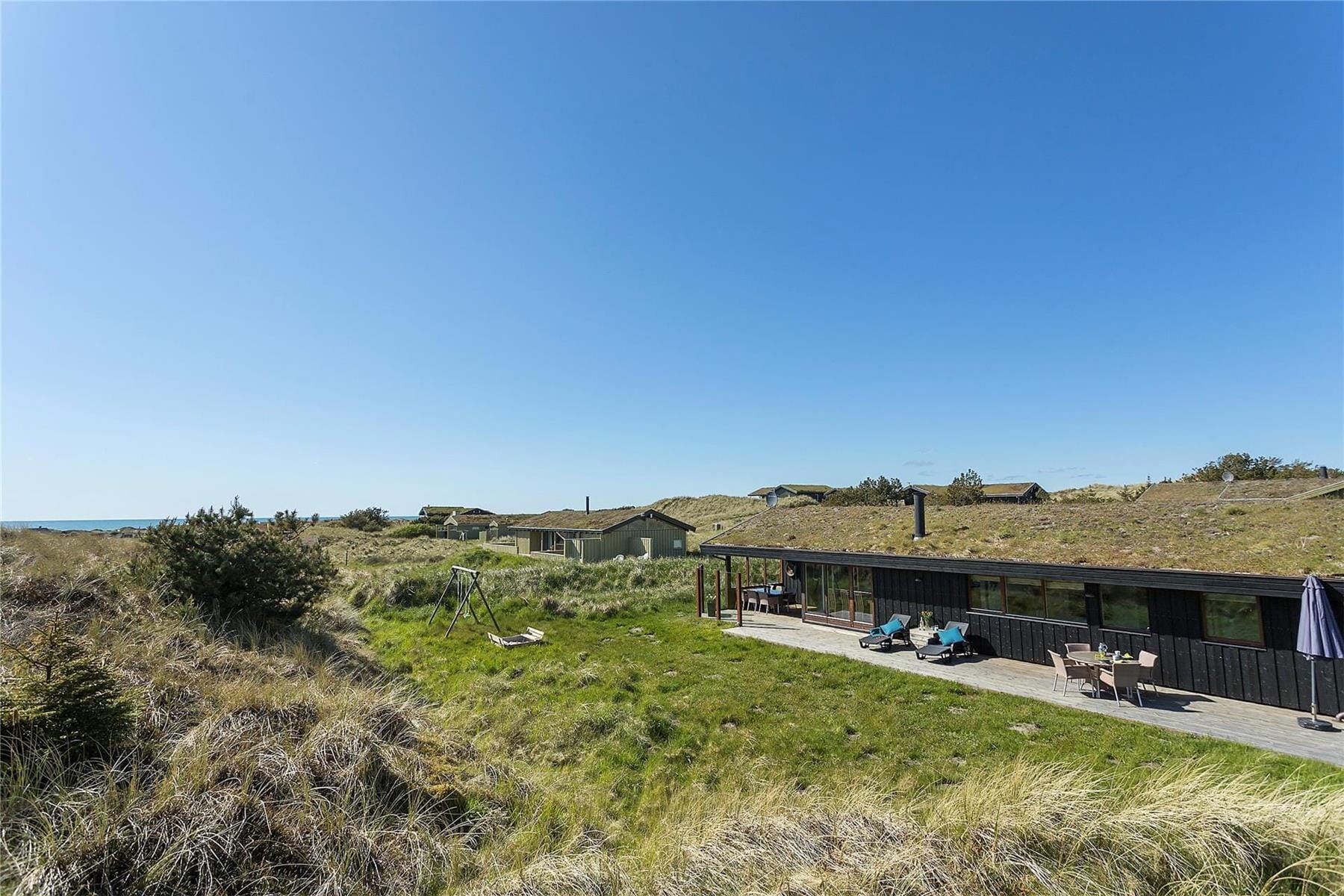 På hele sydsiden af sommerhuset løber en dejlig træterrasse med glasafskærmning og overdækning i det vestlige hjørne. Her kan man altid finde en solplet og holde øje med børnenes leg i sandkassen og gyngerne. Grunden er omgivet af klitter med marehalm, og fra terrassen og toppen af de små bakker har man en formidabel udsigt over Vesterhavet.