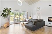 Indenfor mødes du af en lys og rummelig atmosfære, hvor det store køkkenalrum sætter scenen for hyggelige feriedage. Her kan du nyde samværet over en god middag, mens lyset strømmer ind fra de store vinduer, og loftshøjden giver en skøn følelse af luft og plads. Den stilfulde indretning skaber en rolig og afslappet stemning, og på kølige dage kan du tænde op i brændeovnen og lade varmen brede sig. Sommerhuset har en god planløsning med velindrettede soveværelser, så du og din familie kan slappe af og vågne op til fuglekvidder og naturens lyde.