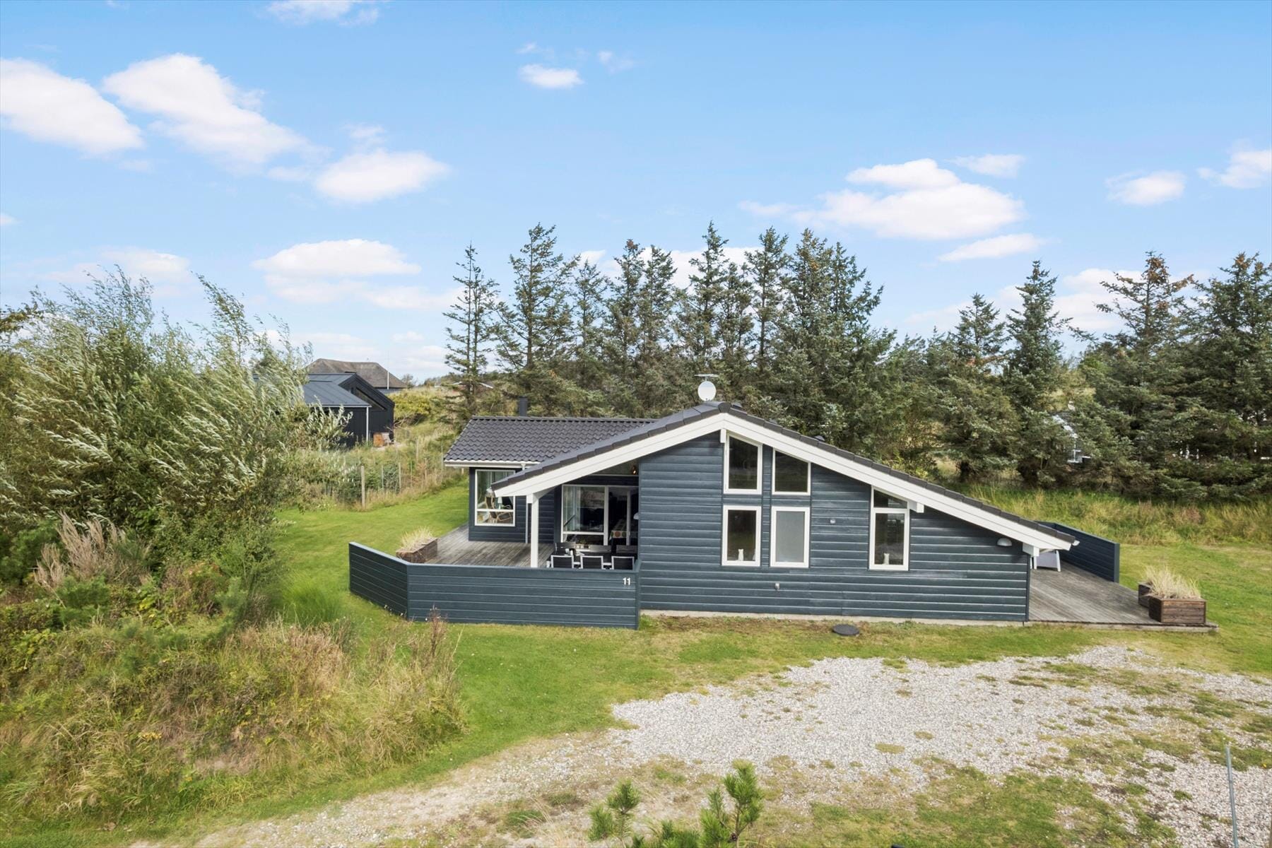 Sommerhuset ligger på en dejlig flot og stor naturgrund der imponerer med usædvanligt gode læforhold, varieret beplantning og et spændende dyreliv. De store sydvest- og østvendte terrassearealer giver rig mulighed for at nyde solen dagen lang og de mange gode havemøbler og liggestole lader ingen ønsker åbne.