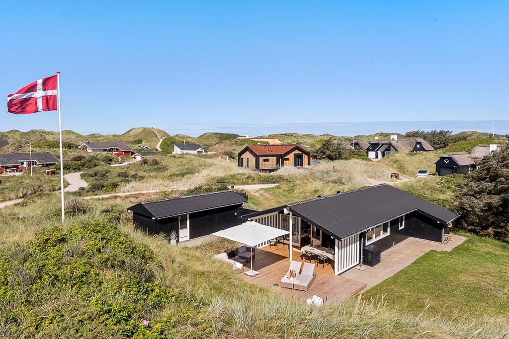 Sommerhusets placering har stor betydning for feriefornemmelsen her på adressen. Man kommer nemlig hurtigt i den rette afslappede tilstand, når man kigger lige ud på klitternes bølgende marehalm og nyder det særlige lys så tæt ved kysten. I stuen er der vinduer vendt mod tre verdenshjørner, så uanset om I sidder i sofaafdelingen, ved spisebordet eller står i køkkenet, kan I finde noget kønt at fæstne øjet ved – og hvis ikke I bruger al tiden på at falde i staver over omgivelserne, kan I hygge jer med at spille kort, se TV eller kokkerere i det lyst indrettede rum. Samme enkle stil går igen på badeværelset og på de tre soveværelser, så alt i alt er det en perfekt ramme til parferien eller for en børnefamilie.