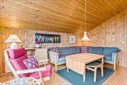 Selv når I hygger jer inden døre, får I udsigt til de grønne omgivelser, for fra husets opholdsafdeling og tre soveværelser kan I kigge lige ud på den fredfyldte naturgrund. Alle rum er hyggeligt indrettede, og planløsningen passer godt til seks personer. I den ene ende af huset ligger et soveværelse med dobbeltseng, og i den anden finder I to soveværelser, hver med en køjeseng. Et rummeligt badeværelse med bruser og vaskemaskine er praktisk placeret lige ved entréen, og endelig er der opholdsafdelingen, der består af to stuer i åben forbindelse. Den ene, en hyggelig opholdsstue med brændeovn, lænestol og sofakrog, ligger nogle trin sænket i forhold til spisestuen, hvor I kan forberede middagen i det åbne køkken og efterfølgende samles omkring spisebordet.