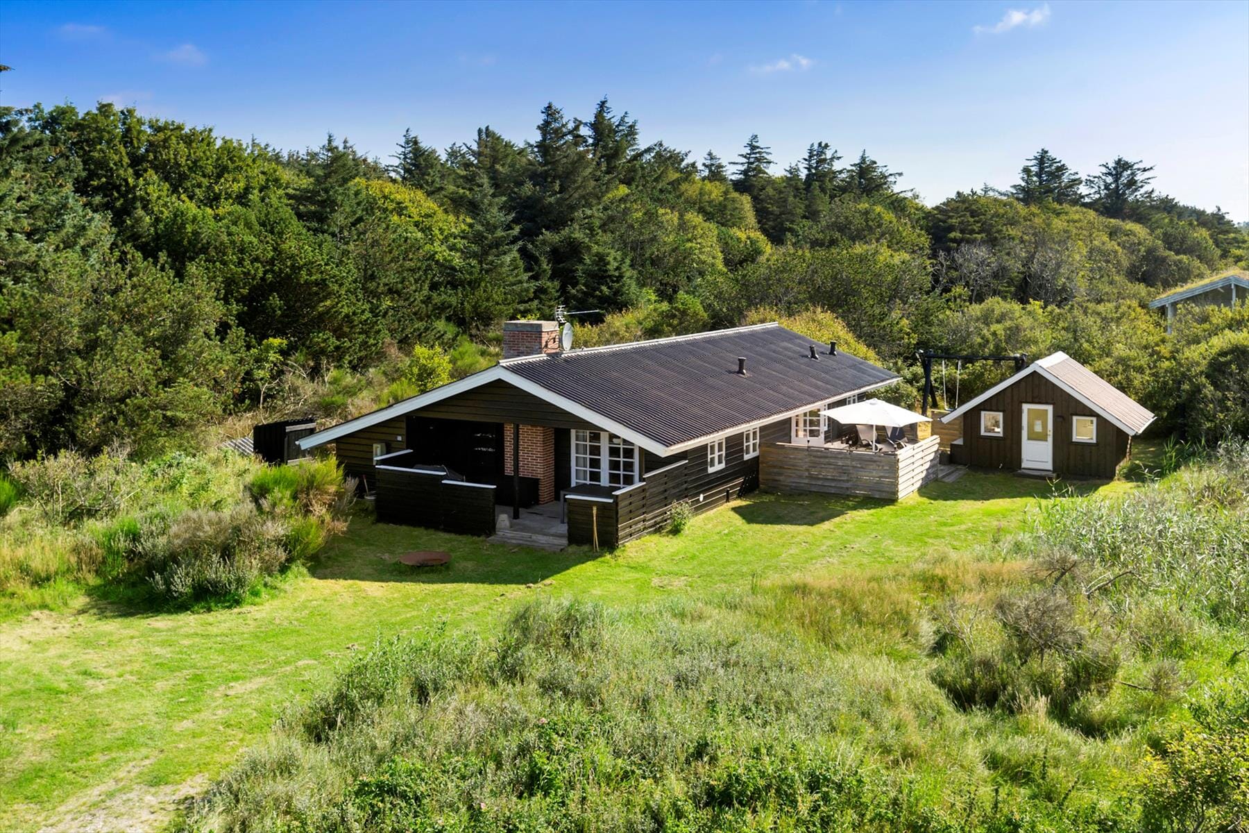Som­mer­hu­sets to træterrasser er lige der, hvor som­mer­li­vet skal nydes: Den ene er åben og sydvendt, så der er sol det meste af dagen, og mod vest ligger den anden, som med delvis overdækning er perfekt til lange aftener med gril­l­mid­da­ge og hyggesnak. En græsplæne omkranser huset, og den tætte rand­be­plant­ning er med til at skærme grunden af på kønneste vis.