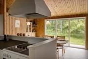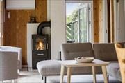 Når du træder ind i dette sommerhus, bliver du mødt af et åbent og indbydende køkken-alrum med højt til loftet. Her er masser af plads til både at lave mad sammen og slappe af, mens du nyder udsigten til de grønne omgivelser gennem de store vinduer. Brændeovnen skaber en hyggelig atmosfære på de køligere dage, hvor du kan slappe af med en god bog eller nyde tid sammen med familien. Det store badeværelse byder på både spabad og sauna, så du kan forkæle dig selv med wellness, når dagen er slut.