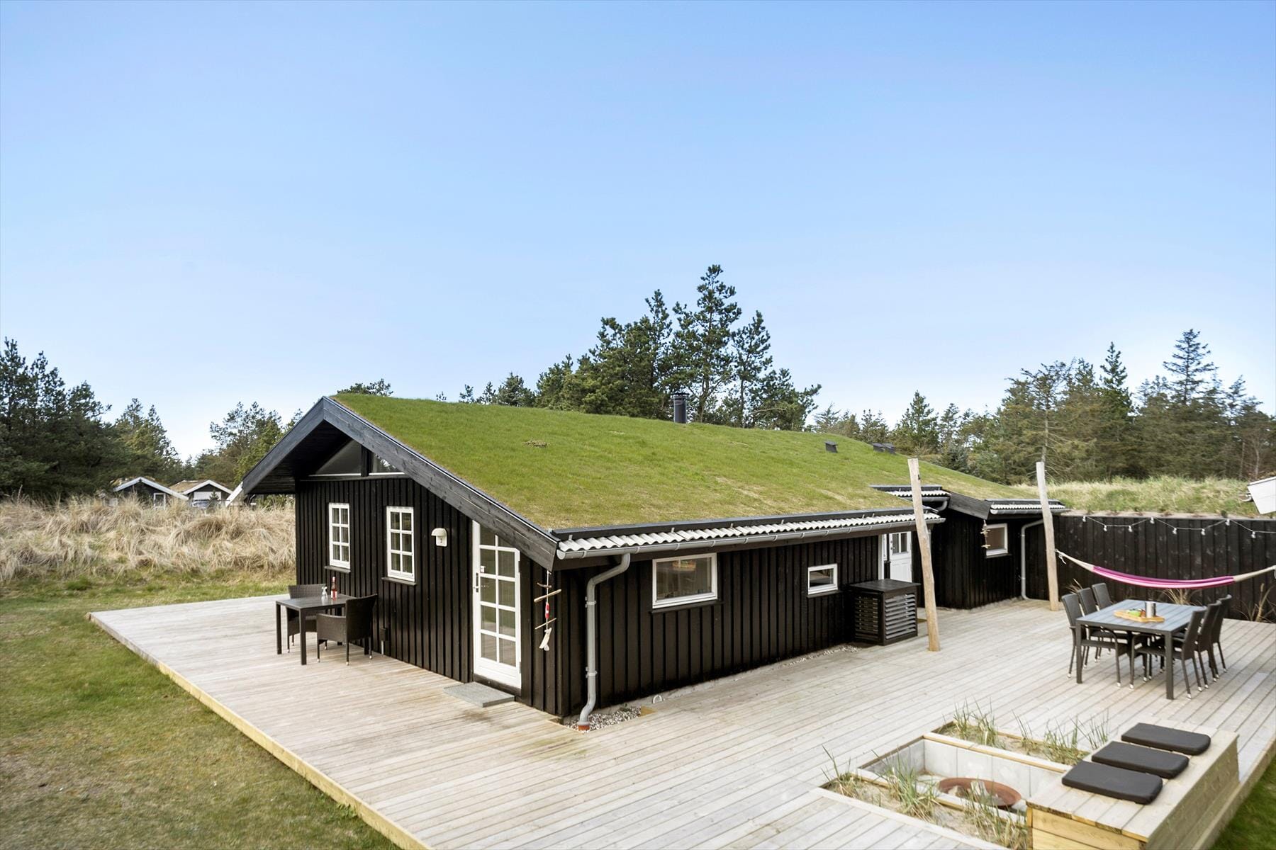 De mange gode detaljer fortsætter ude i det fri, hvor en stor træterrasse breder sig rundt om huset. I kan finde opholdspladser mod både øst, syd og vest, hvis I vil følge solen dagen lang, og om aftenen kan I tænde for de kulørte lamper og tænde op i ildfadet, spille dart eller gøre grillen klar til et udendørs festmåltid. Terrassearealet mellem huset og udhuset ligger særligt godt i læ, og på græsplænen har I plads til at lege.