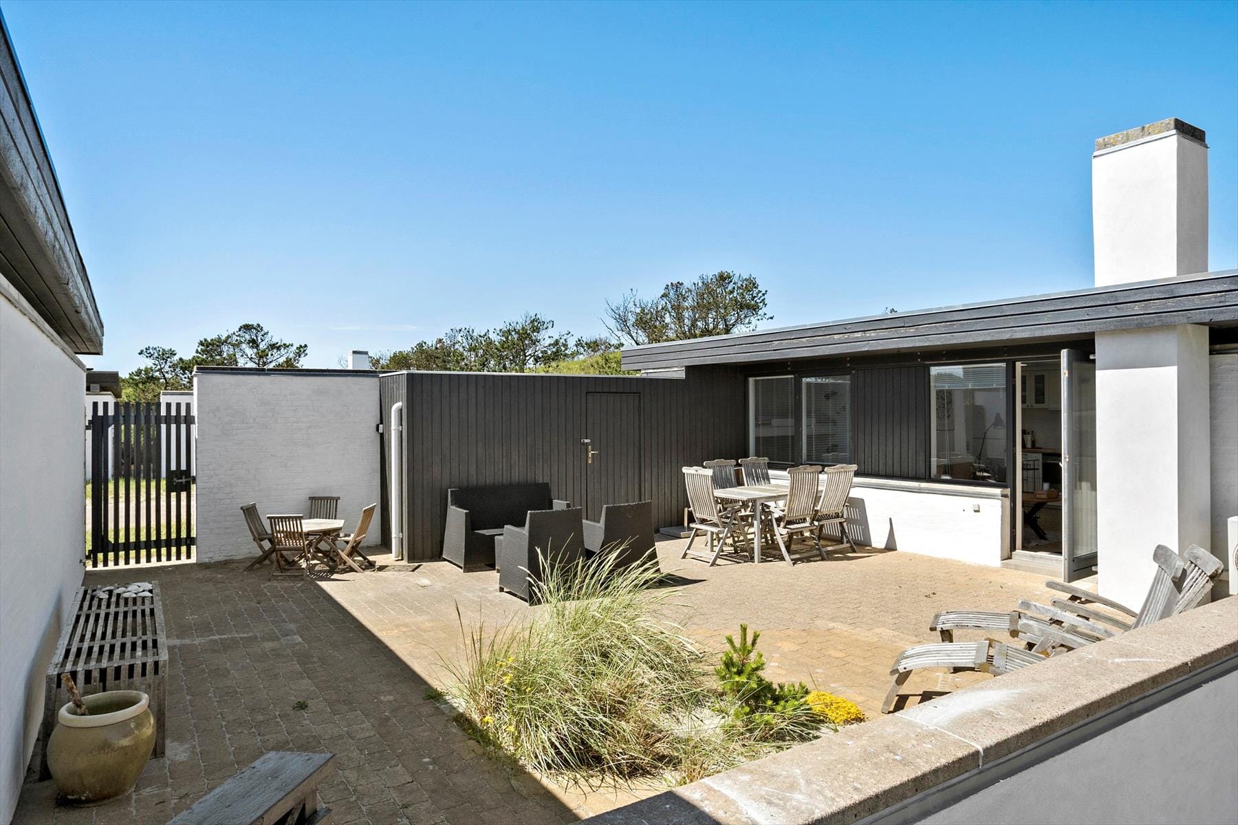 Sommerhuset er omgivet af en skøn, lukket gårdhave, hvor I kan nyde livet i fuldkommen ro og uforstyrrethed. Her kan I starte dagen med en kop kaffe i morgensolen, lytte til fuglesang og mærke roen sænke sig. Den lukkede gårdhave er perfekt til solbadning, hyggelige grillaftener og stunder med en god bog. På den store terrasse kan I nyde udsigten til den smukke natur og fornemme havets nærhed. Når I har brug for at køle af, ligger Vesterhavet kun en kort gåtur væk, hvor I kan tage en forfriskende dukkert eller gå en tur langs stranden og nyde synet af bølgerne, der slår mod kysten.