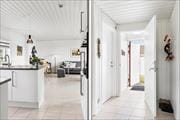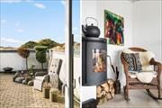 Det er tydeligt at se, at der er gjort meget ud af indretningen, så du kan slappe af i stilfulde og komfortable omgivelser. Planløsningen er også god, for stue og køkken ligger i åben forbindelse, så det er muligt at hyggesnakke på tværs af rummet, hvis en eller to personer laver mad og resten af selskabet sidder i sofaafdelingen nær brændeovnen. Lysindfaldet er godt, og gennem det store, vestvendte vindue kan du se lige ud i solgården og videre mod klitterne. Soveværelser er der to af, og selv badeværelset er indrettet på smagfuld vis, så morgenbadet kommer til at foregå i et indbydende rum.