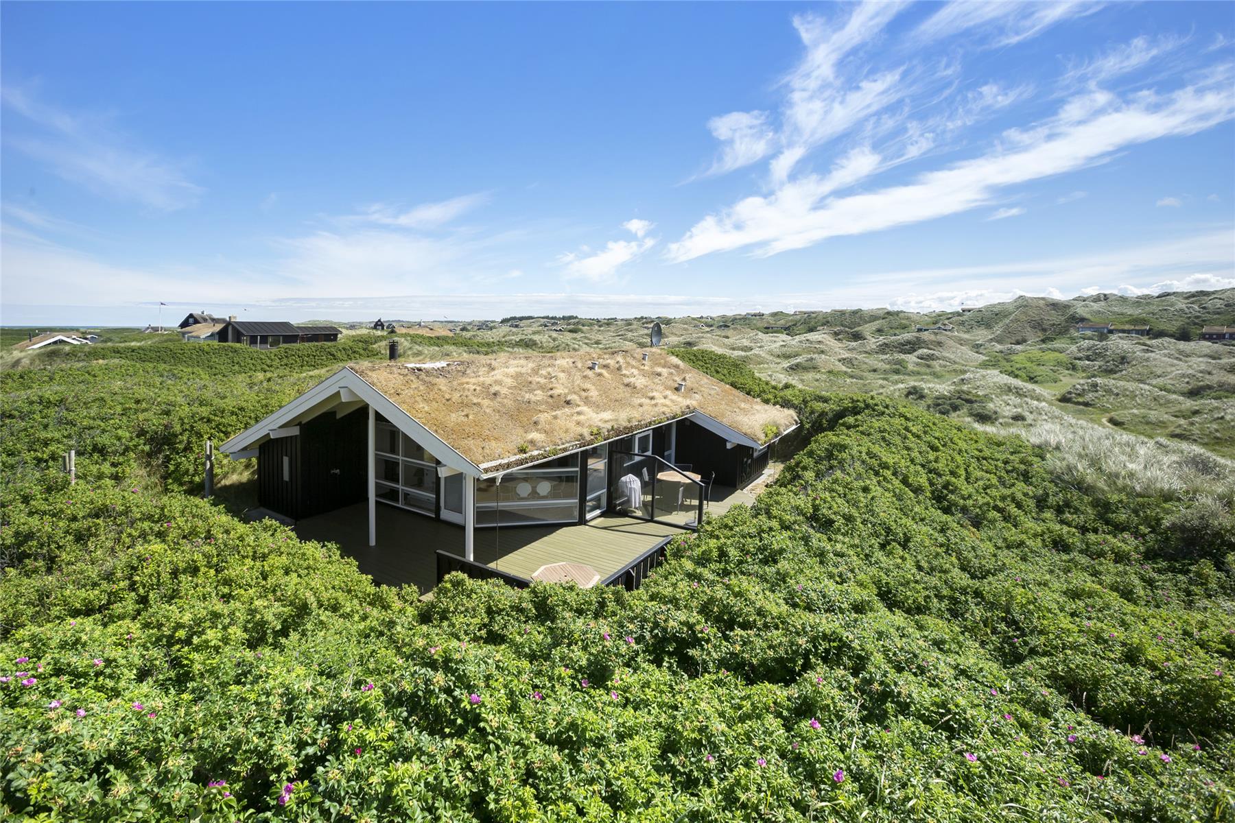 Som­mer­hu­set ligger på en stor og flot na­tur­grund i klitterne med store hy­ben­bu­ske, som giver god og nyttig læ for Ve­sten­vin­den. Fra stuen er der adgang til den store terrasse, hvor der er god plads til at slikke sol, grille og bare nyde sommeren i ro og mag. Der er grill, havemøbler og lig­ge­sto­le til rådighed, så husk en god bog eller det nyeste ugeblad.