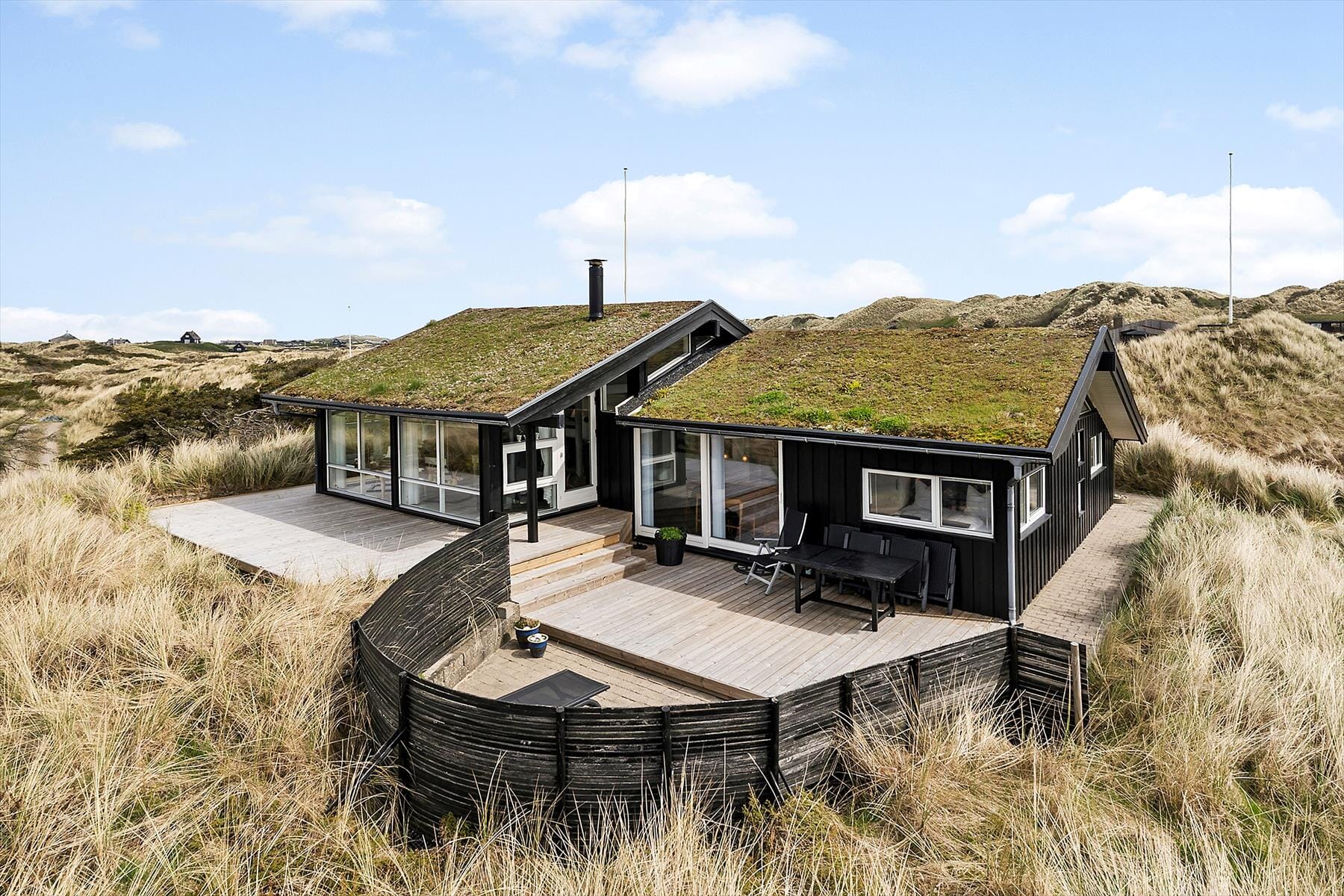 Den store klitgrund med græs, sand og marehalm ligger lidt oppe, og man har derfor en dejlig udsigt over landskabet og Vesterhavet fra de høje klitter. Der er terrasser på begge sider af sommerhuset, så det er muligt at flytte rundt i løbet af dagen for at finde læ og udnytte alle soltimer.