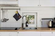 Du kommer ind i huset via den store træterrasse og befinder dig straks i det lysfyldte køkken- og spiseområde med højt til loftet og store vinduer. Køkkenet har alt, hvad du behøver til at tilberede og servere almindelige retter, herunder elkomfur, ovn, køleskab og fryser, mikroovn, elkedel og kaffemaskine. Du kan spise dine måltider enten ved spisebordet eller på træterrassen med havemøbler og grill. For at slappe af, læse eller se tv kan du trække dig tilbage til stuen med ståhøjde, som er tilgængelig via en trappe og er indrettet med en sofa og to lænestole. Til venstre for køkkenkrogen ligger badeværelset med toilet og bruser. Der sover man i soveværelset med dobbeltseng og køjeseng i kælderen, som er adskilt fra køkken- og spiseområdet med en skydedør. Om nødvendigt kan der stilles en ekstra seng til 2 personer op på loftet. Der er også en barneseng til småbørn til rådighed. Grunden er ca. 250 m² stor. Heraf er ca. 150 m² græsplæne til leg. De har eksklusiv adgang til saunaen i sidebygni