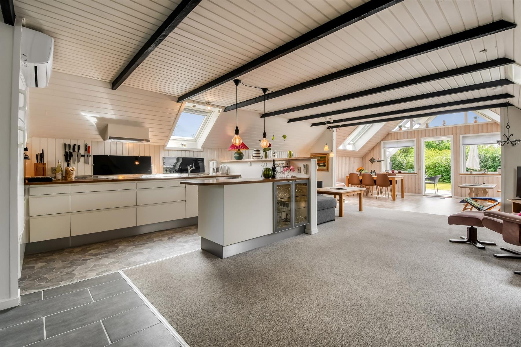 Hvis du trænger til at slappe af med dem, du holder allermest af, kan du allerede nu begynde at glæde dig til at spise brunch ved spisebordet, spille brætspil og se film i sofaafdelingen. Hvis I kan lide at lave mad, er det åbne køkken et godt sted at kræse om retterne – eventuelt ved fælles hjælp, for her er god plads takket være den gennemtænkte indretning. Stuens brændeovn står klar til eventuelle kølige dage og aftener – og hvis du vil mærke varmen brede sig helt ud i tåspidserne, kan du gå i udhusets sauna. Soveværelser er der to af i huset, så planløsningen passer fint til fire personer.