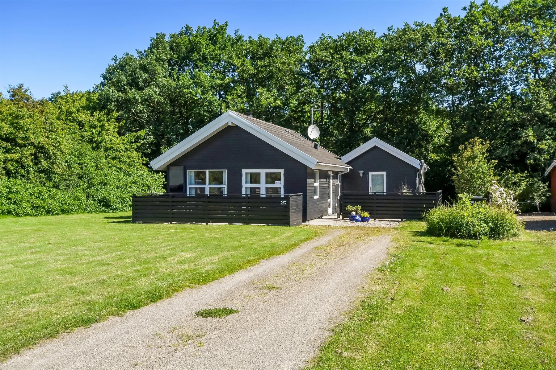 Stråler solen fra en blå himmel, gør at I måske får lyst til at tilbringe mest muligt af dagen ude i det fri. I så fald kan I flytte alt lige fra morgenmaden til leg, avislæsning og hyggesnak ud på sommerhusets grund, der er enkelt anlagt med græsplæne og terrasseområder. De to terrasser er begge lukkede af hegn, der giver læ og sikrer privatlivet, når I slapper af i havemøblerne.