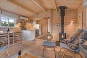 Indenfor mødes du af en varm og indbydende atmosfære, der emmer af klassisk sommerhusstemning. Den hyggelige stue med sine bløde møbler og lyse trævægge skaber de perfekte rammer for afslappende stunder – måske med en god bog eller en spændende film på tv’et. Brændeovnen spreder varme på kølige dage og gør det ekstra hyggeligt at opholde sig indendørs. Køkkenet er veludstyret og inviterer til, at I sammen kan tilberede lækre måltider, som kan nydes ved spisebordet med udsigt til haven. Her er alt, hvad I behøver for at sætte farten ned og lade roen falde over jer.