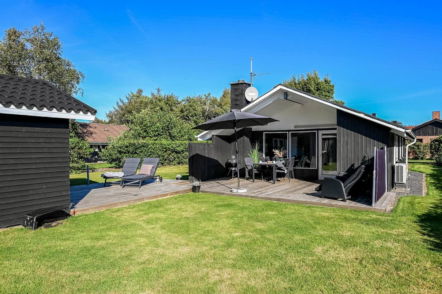 På grunden er der god plads til at parkere på grusbelægningen foran huset, mens baghaven er dedikeret til leg og afslapning. På græsplænen kan både børn og voksne spille bold og havespil, mens gyngestativet og sandkassen formentlig mest er til de yngste feriemedlemmer. Står der afslapning på programmet, er den sydvendte, delvist overdækkede terrasse et herligt sted at nyde solen det meste af dagen.