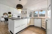 Der blev tænkt på både hygge og funktionalitet, da sommerhuset blev bygget i 2012. På det funktionelle plan kan rumfordelingen nævnes, for med tre gode soveværelser, et badeværelse, et bryggers med vaskefaciliteter samt en stor stue med integreret køkken finder I alt, hvad I skal bruge inden døre. Stuens brændeovn hører til hyggedetaljerne – og det samme gør alkoven, for den er perfekt i løbet af dagen, hvis I vil læse eller har lyst til en lille siesta. Alle rum præsenterer sig i øvrigt på lys og indbydende vis, og særligt i stuen er lysindfaldet ekstra optimalt takket være det store vinduesparti, der går fra gulv til loft.