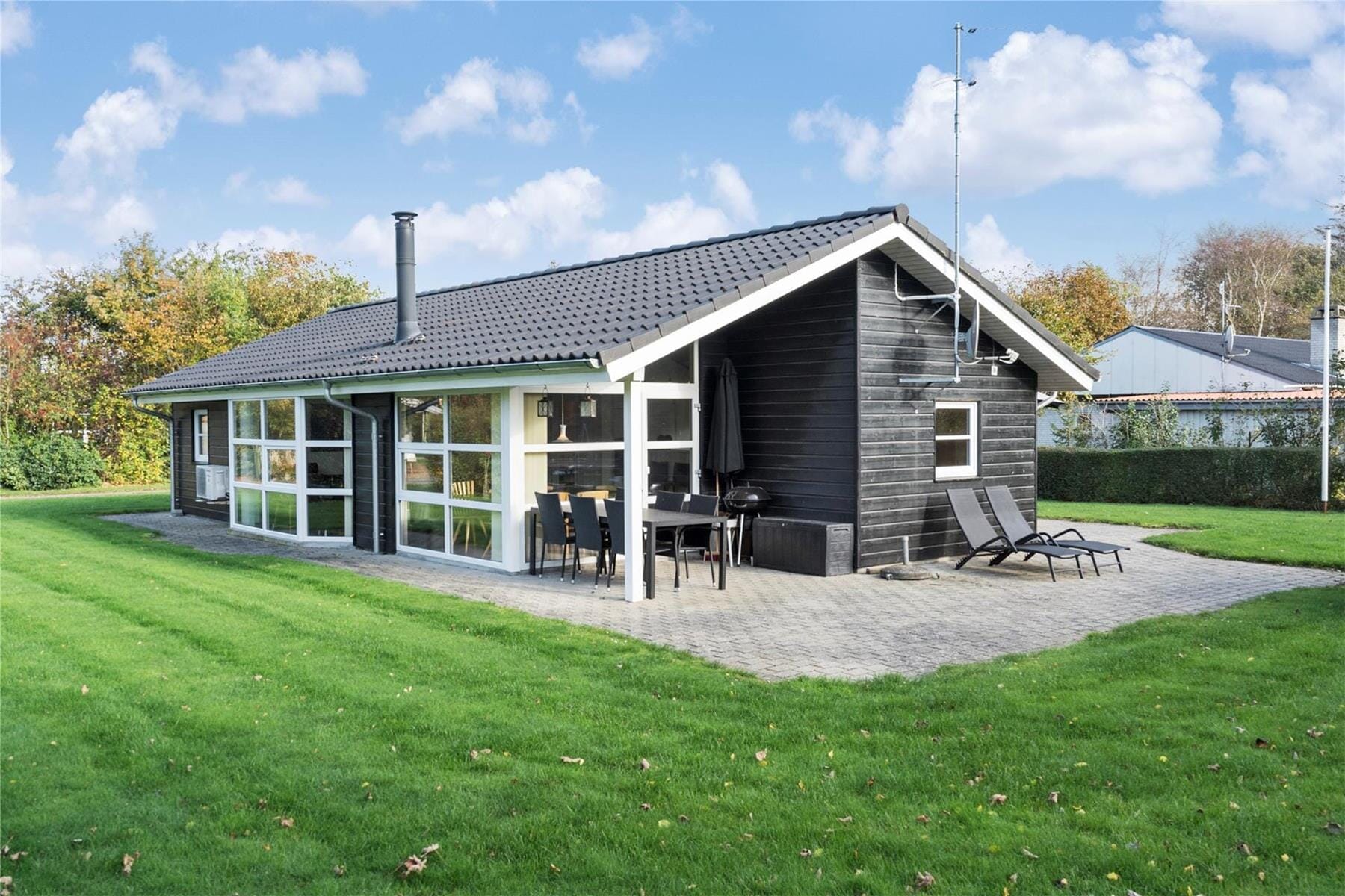 Indbyder vejret nærmere til solbadning frem for spabad, er der masser af plads til at nyde livet på den 1000 m2 store grønne grund. Leg og boldspil kan foregå på den store græsplæne, hvor der også står et gyngestativ til de yngste feriegæster. De mere tilbagelænede stunder kan udfolde sig på den flisebelagte terrasse, der er rundt omkring næsten hele huset. En del af terrassen er overdækket og der er både parasol, havemøbler og liggestole til rådighed.