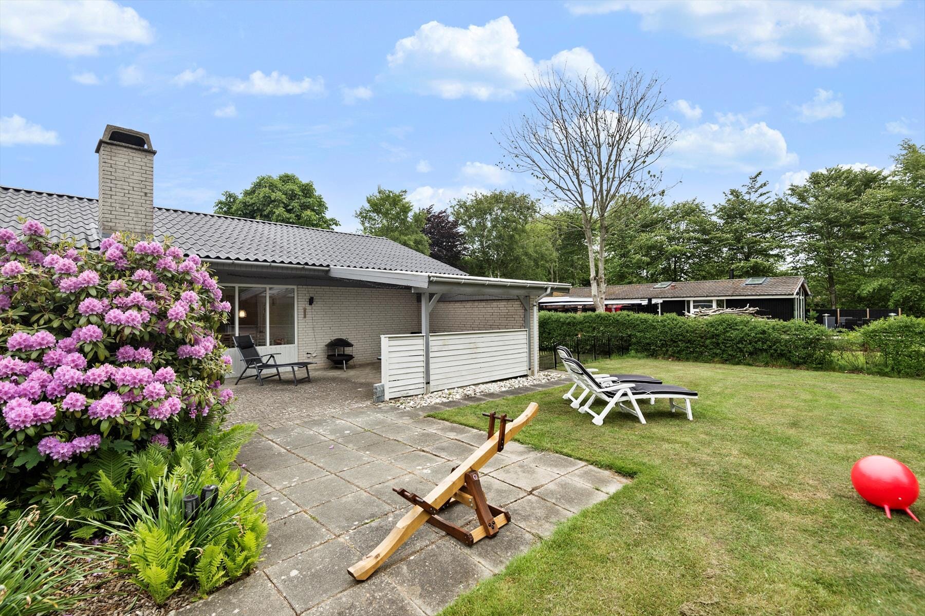 Ude på den grønne grund er der god plads til at lege og spille havespil på græsplænen. Vil I grille eller læse næste kapitel i den medbragte krimi, er det måske nærmere det sydvendte terrassemiljø, der lokker – og her er der både et overdækket og et åbent areal at vælge imellem, inden I slår jer ned i havemøblerne. Grunden er for øvrigt indhegnet, hvilket er rart for hundeejere og småbørnsforældre, så hverken hunde eller børn forvilder sig ud på vejen.