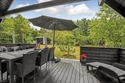 Vågner I op til en solrig sommerdag, kan I tage morgenkaffen med ud på den delvist overdækkede terrasse. Mens I sidder og strækker jer, bliver I måske akkompagneret af fuglesang fra trætoppene, men ellers er der nu ganske fredeligt her i det skovklædte sommerhusområde. Terrassen er stor, og derudover er der godt med plads på græsplænen, uanset om I vil slænge jer eller spille bold i det grønne.