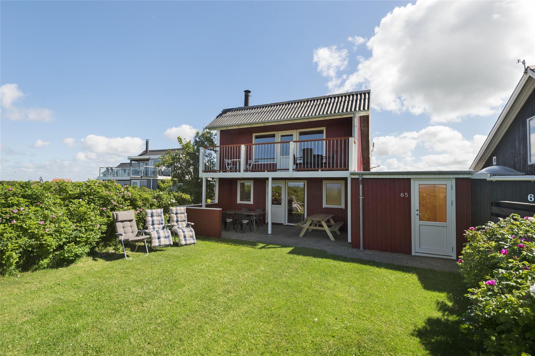 Udsigten over Ringkøbing Fjord og surfstranden kan især nydes fra førstesalens vestvendte altan, så det kan hurtigt blive jeres foretrukne udendørs opholdsplads. Det er nu også rart at slappe af på den delvist overdækkede terrasse eller at slænge sig i solen på grundens grønne græsplæne.